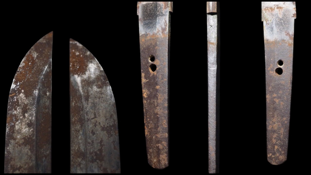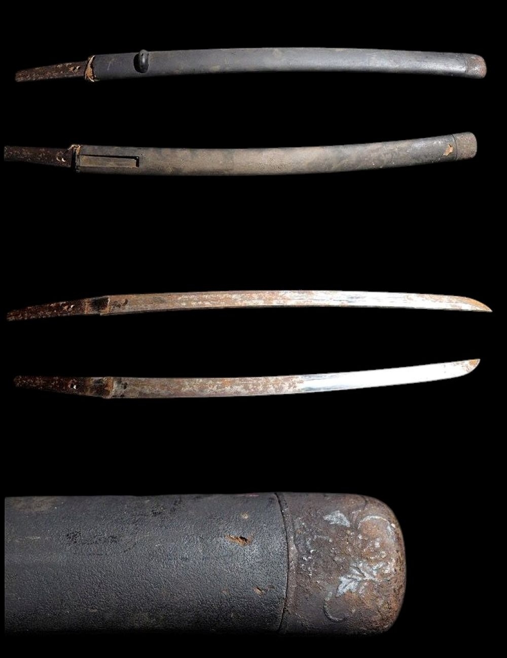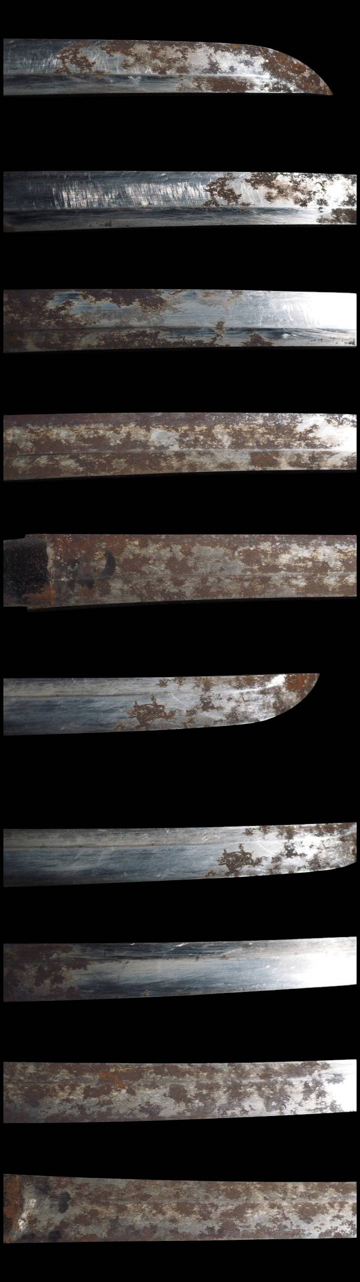 登録 長野県教育委員会発行 第79444号 平成4年10月15日交付 確認済 種別 脇差 銘文 無銘 全長 68cm 白鞘 拵え等を含む 刀身のみ長さ 58.2cm 刃長 53.7cm 反り 1.2cm 目釘穴 2個 元幅 3.23cm 元重ね 6.9mm 先幅 2.46cm 物打ち付近 先重ね 5.6mm 物打ち付近 以上測定の誤差はご容赦ください 拵 白鞘等 画像の抉り付き黒鞘入り 鑑定書等 はばき等 無 欠 その他 刀身のみ重量 533g | |||