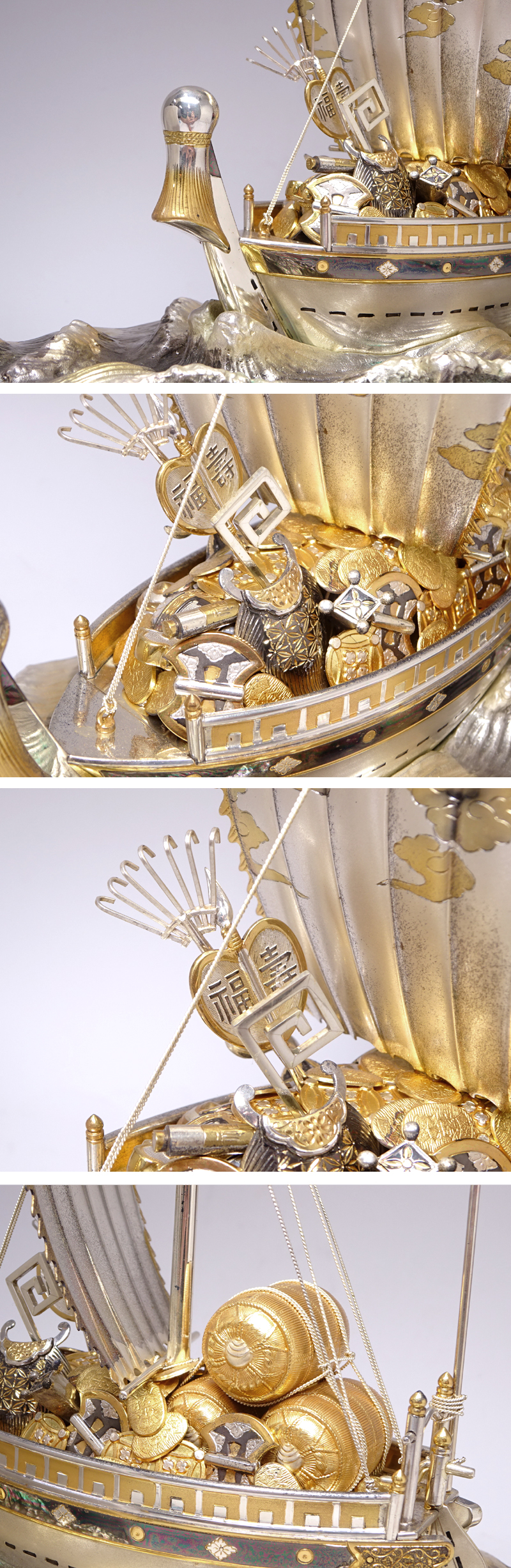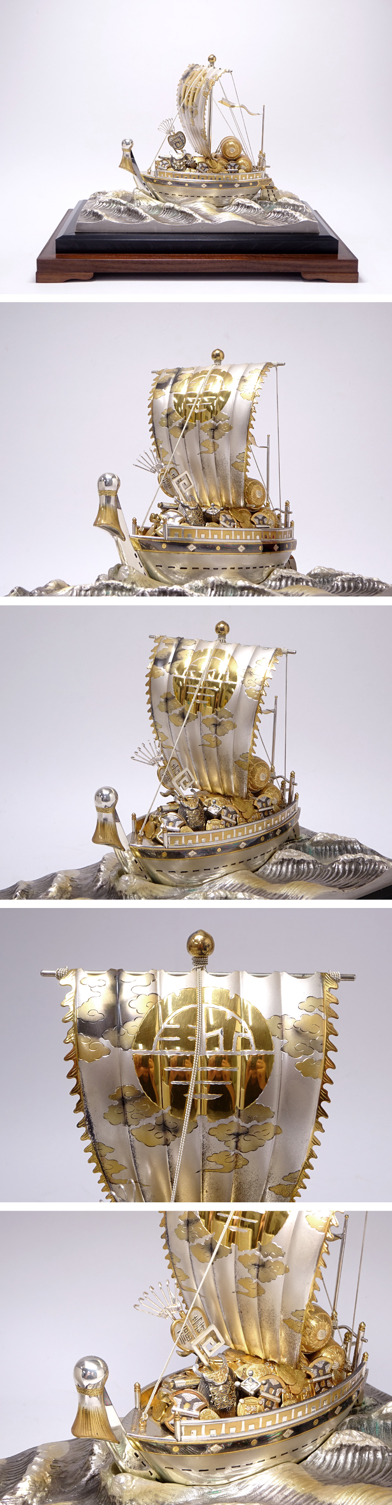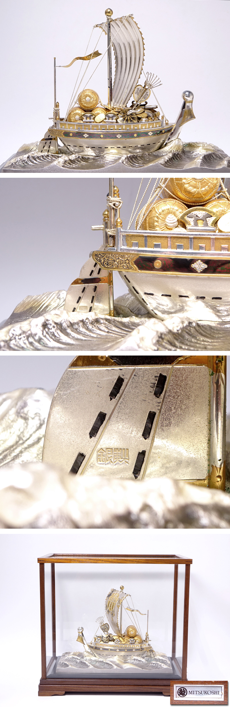 錺職人として二代に亘り活躍し、伝統工芸士にも認定された東京銀器の名工【関武比古】作。 作者を示す刻印はありませんが精巧な作行きから【初代 関武比古】の作品と推測されます。 カタログによる参考値となりますが、同様の現行作品「宝船3号(房)」は銀目方で330g、価格は880,000円(税込)となっています。 ホームページよりご確認いただけます。 現在、銀の価格もかなり高騰しておりますので、美術品としてはもちろん投資としても価値ある逸品です。 船体後方に銀製刻印あり。 専用ガラスケース(若干小傷あり)の側面に三越シールあり。