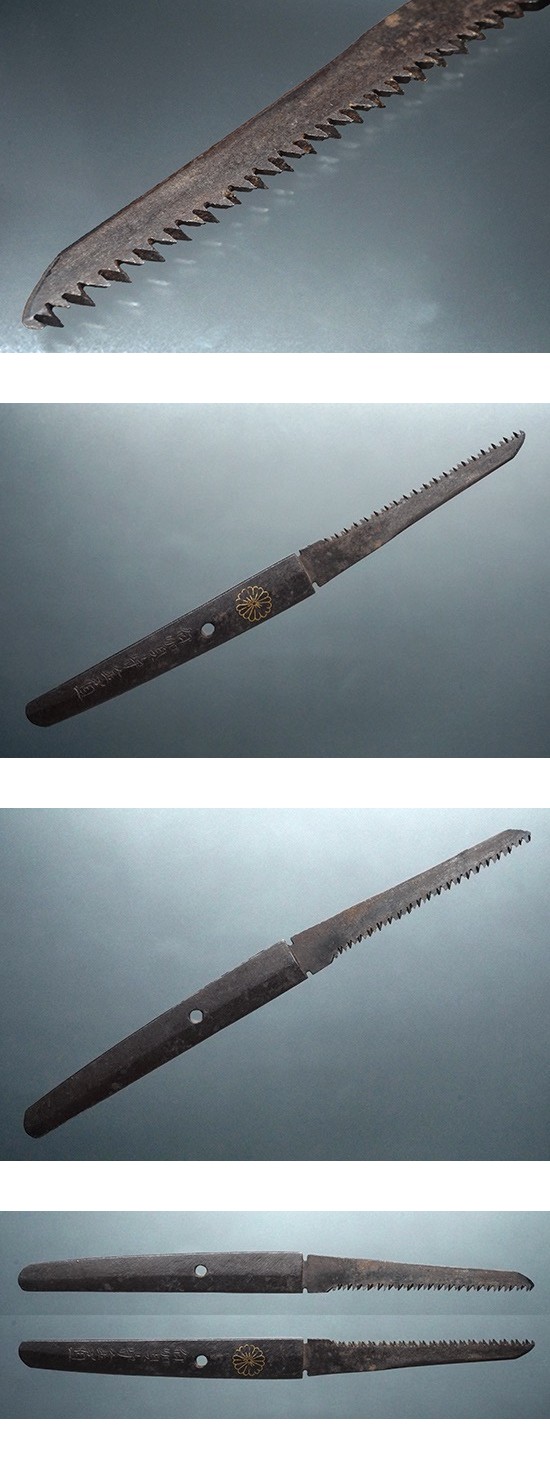 鋸刃になっている小刀は珍しく、また、小柄の部分が刀の茎形になった遊び心のある共小柄です。