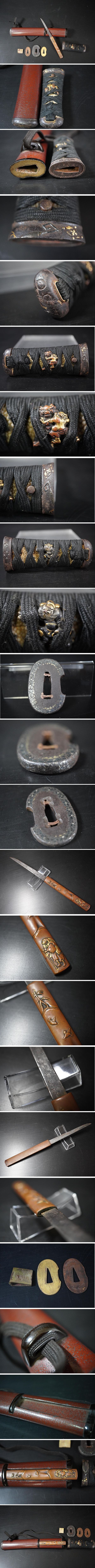 ご覧いただきありがとうございます。 時代武具 短刀拵え 茶漆鞘 [鉄地 銀象嵌 鍔] [鉄地 象嵌宝尽図 縁頭] [鍾馗鬼退治図 揃目貫] [舌切雀図小柄 在銘穂先] 刀装具です。 目貫は片面に鍾馗図、片面に鬼図の鍾馗鬼退治を題材にした金具となっております。 小柄は素銅地高彫の舌切り雀図、穂先は袋に圧着して抜けませんでしたが 在銘「江州住人源…」まで読めます。 擦れ、シミ、汚れ等あります。(それぞれ状態は画像を確認の上、ご判断願います。)