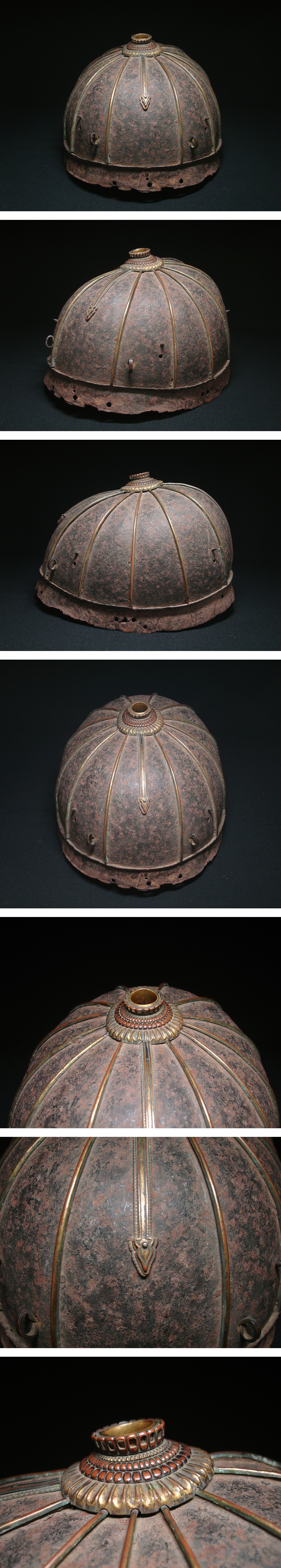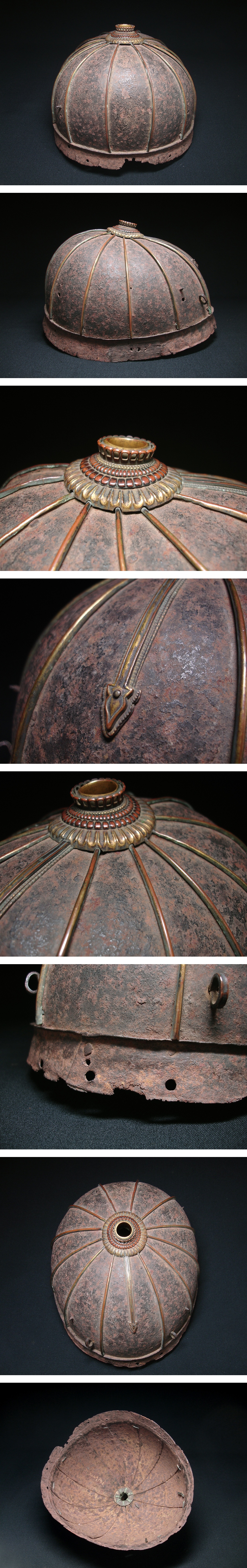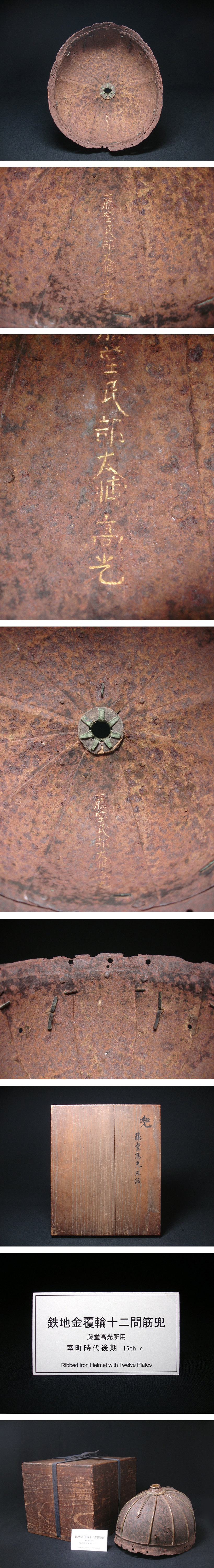 本物保証! 室町時代後期(16世紀)の古作、非常に古く見事な「鉄地金覆輪十二間筋兜」です。 鉢は阿古陀形をなし、鉢表面の各筋に銅地鍍金の覆輪をかけています。 そして八幡座の造りも装飾性高く、室町後期・戦国時代当時にして非常に高尚で格の高い兜であることが分かります。 鉢内部には「藤堂民部大輔高光」の金象嵌銘が入っています。 藤堂高光の所用であり、この人物は藤堂氏の武将のひとりと考察されます。 また、展覧会の展示札が付属していることから、この兜は何らかの展覧会に出陳された経歴を持っていることが分かります。 時代箱入。 正真正銘本物保証!
