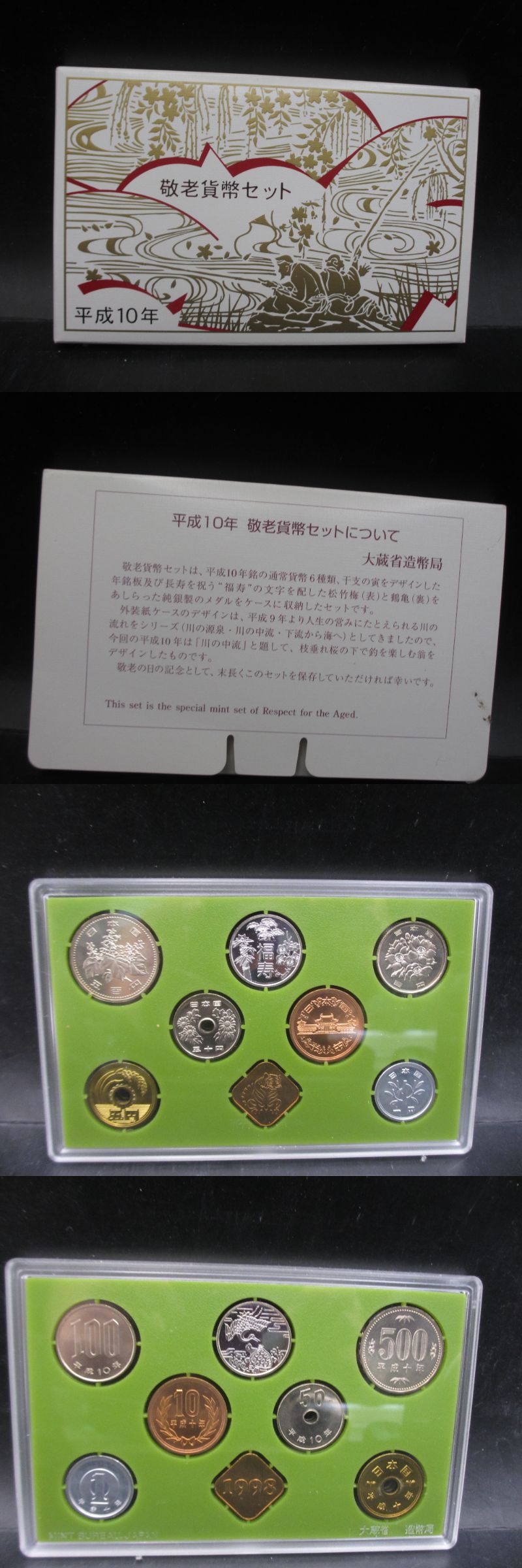 この「敬老貨幣セット」は、平成9年から「人生の営みにたとえられる川の流れ」をテーマにシリーズ化されており、今回の平成10年は「川の中流」として、秋の桜の下で釣りを楽しむ翁がデザインされています。