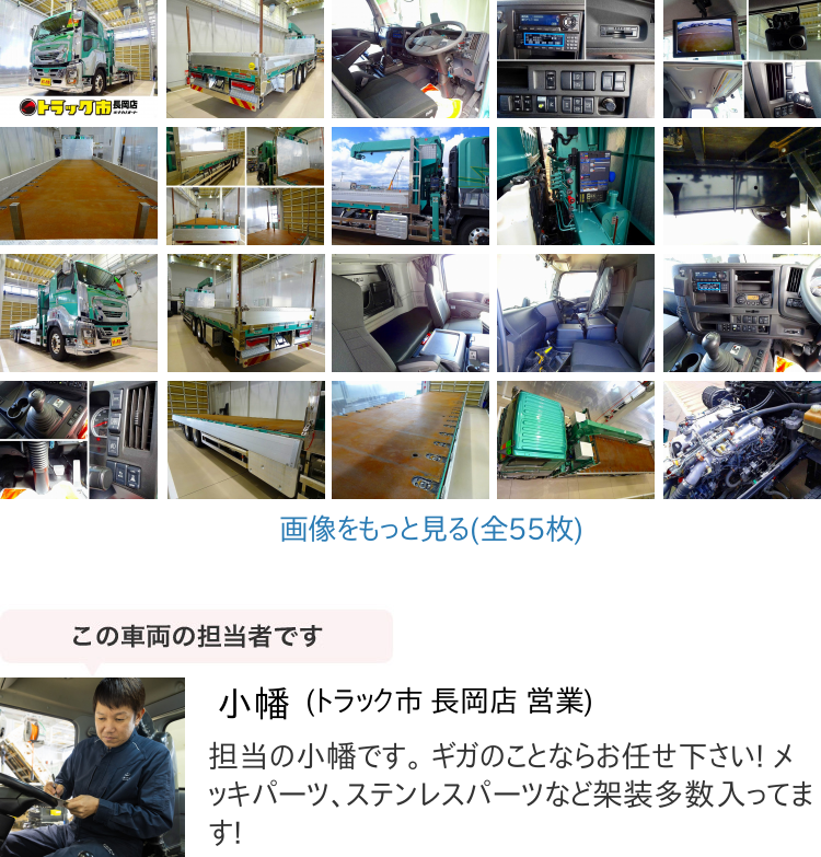 【装備】 オートAC PS PW SRS ABS キーレス 左電格ミラー/ヒーター/ワイパー ETC バックモニター エアサスシート/肘掛け/シートヒーター付 ドラレコ デジタコ アドブルー ターボ 排気ブレーキ E/Gリターダ デフロック クルーズコントロール 坂道発進補助装置 車線逸脱警報装置 衝突被害軽減ブレーキ アルミホイール フォグランプ トラクションコントロール 室内LED灯/カーテン アルミ製燃料タンク300L×2個 タイヤ止め4個 クレーン足場板2枚 ステンレス製リアフェンダー/サイドガード 右シャシ中央アルミ縞鋼板工具入れケース 右シャシリアステンレス製工具箱 リアシャシアルミ縞鋼板リン木入れケース 消火器1個
