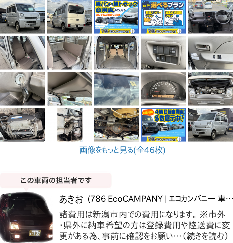 | ▼販売店コメント | 【情報】 ・PCハイルーフ ・平成27年式 ・162000㎞ ・5AGS ・4WD(パートタイム) ・修復歴無し ・2年車検付き 【装備】 ・パワーウインドウ ・キーレス ・天井格納ボックス ・衝突軽減ブレーキ 【直近交換部品】 ☆ラジエーター ☆パワステ 【概要】 ・会社名786エコカンパニー ・住所新潟県新潟市南区下塩俵1456‐1 ・TEL080-4096-1315(担当・山際) ・メール[email protected] 【支払い方法】 ・現金 ・銀行振込み ・ローン払い(提携先アプラス様)例 最大84回払い/金利5% ・銀行ローン ※ヤフーかんたん決済及びクレジットカード決済は非対応です。 【その他】 ・現車確認等は基本的に予約必須です。 ・他にも未掲載の在庫もある為、気になる方はお問い合わせ・ご来店等お待ちしております‼ |