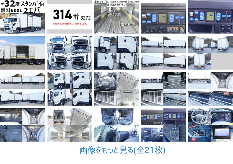 販売店による評価| 外装の状態 | 部分的に目に見えるキズやヘコミがあるものの、比較的きれいな車 | | 内装の状態 | 部分的に目に見えるキズや汚れ、穴があるものの、比較的きれいな車 | | 車両状態コメント | スタンバイ 2エバ -32度 低温 冷蔵冷凍 -14度確認済(アイドリング1時間)積載13.2t 後輪エアサス ベット 左電動格納ミラー バックカメラ 集中ドアロック有り 大型 車検証サイズ1190X249高379 荷台内寸932X228高223 |
