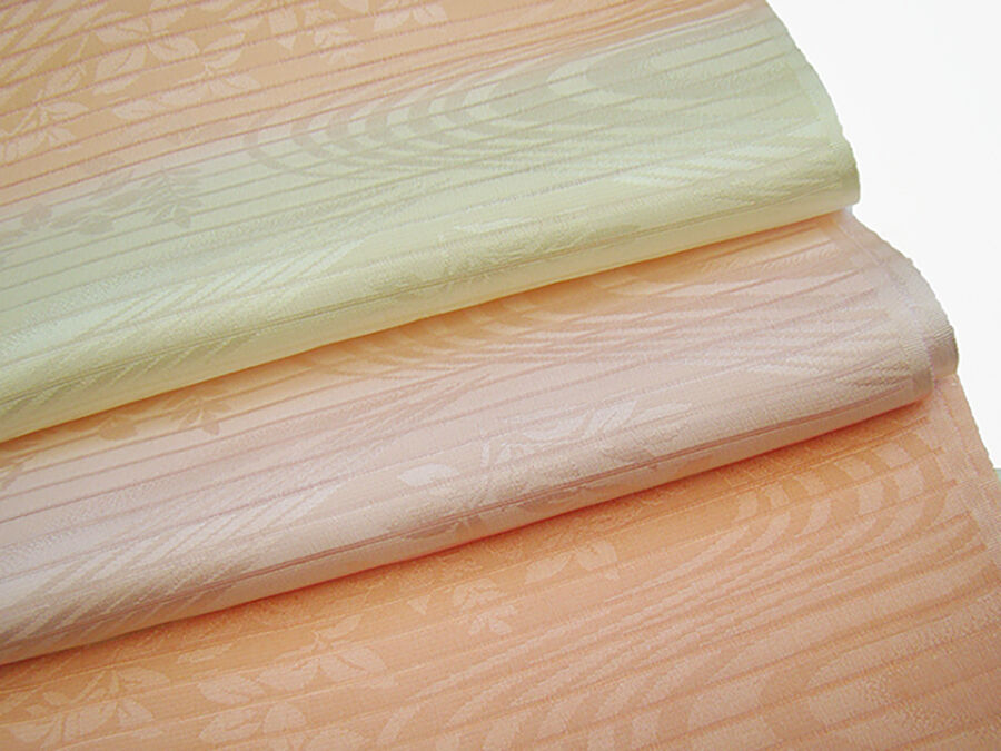 商品の説明 | ●帯揚:正絹 絽 | 赤香色、薄桃色、薄黄緑色ぼかし地に花草や流水の地模様。 長さ、約174cm 幅、 約29.5cm |