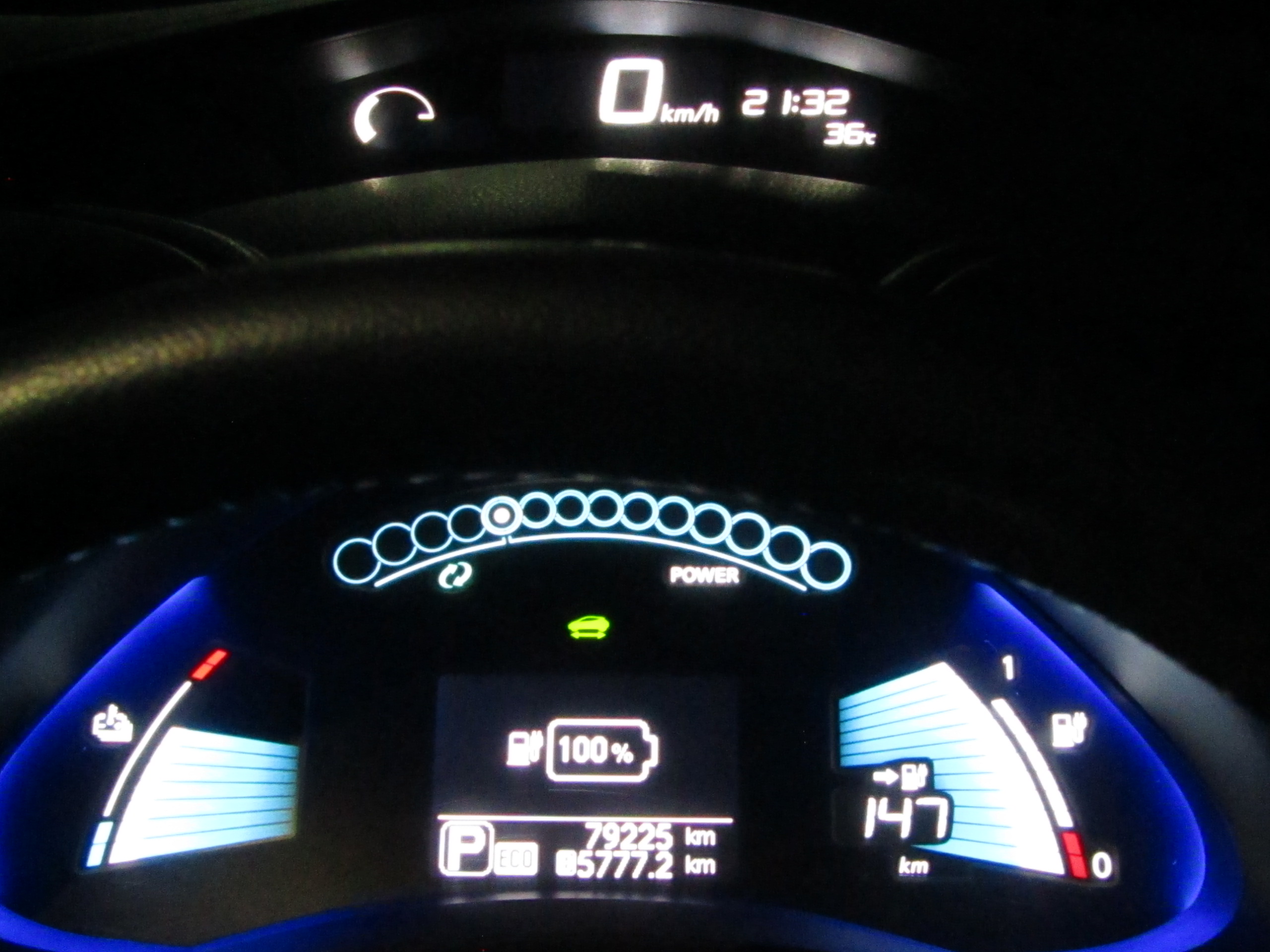 上下二段の「ツインデジタルメーター] エコ運転走行後、再満充電で 走行可能距離表示 147kmです