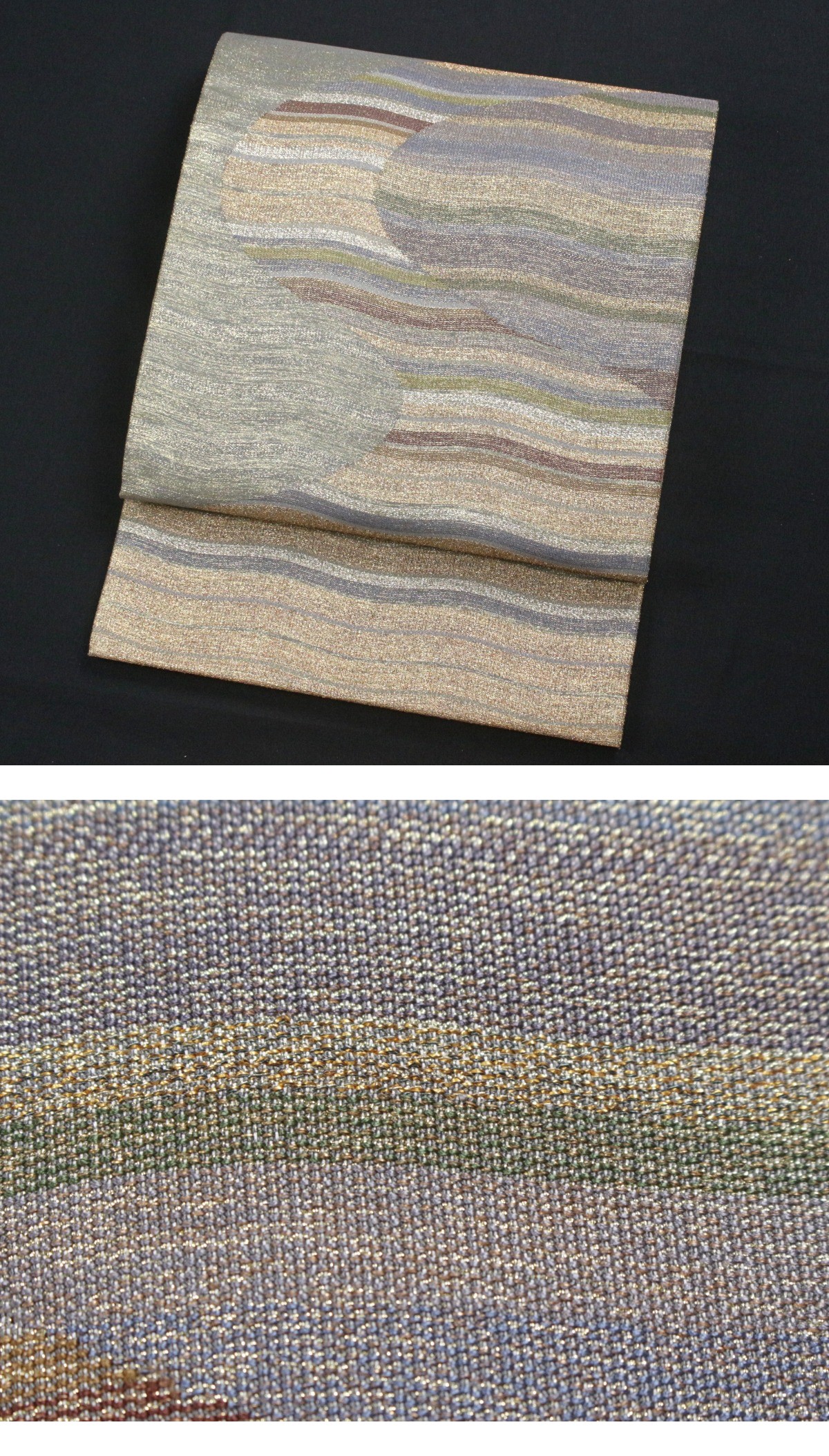 伝統技法「爪掻本綴織」による、西陣織の正絹袋帯のご紹介です。 熟練の職人が爪を使って一本一本の緯糸を掻き寄せながら織り上げる「爪掻本綴」は、機械織では再現できず、その精緻さと立体感は人々の心を魅了します。 また、しなやかな張りとしっとりとした質感を併せ持ち、結び心地の良さも特徴の一つです。 今回ご紹介のお品は、柔らかな銀地を基調に、波の流れを思わせる「曲水文」が優雅に表現され、淡い紫や金、銀、若草色など多彩な色糸が重なり合うことで、繊細な光の揺らめきを生み出しています。 また、三通柄として帯全体に流れるように文様が配置されており、着姿に上品な華やぎと奥行きを添えてます。 フォーマルな場面はもちろん、品格ある装いを求められるお茶席や式典などにもふさわしい逸品です。 是非お手元で代々ご愛用くださいませ。 ※撮影時の部屋の照明によって画像の色に若干の差がございます。色味に差がございますことをご了承のうえご検討下さいませ。 …状態… 未使用品。 ※全くの新品ではございませんので、記載のない変色やスレ、ヤケ、その他僅かな難がある場合がございます。そのような理由でのキャンセルはお受けできませんので、ご了承の上ご検討お願いいたします。 |