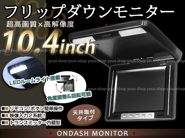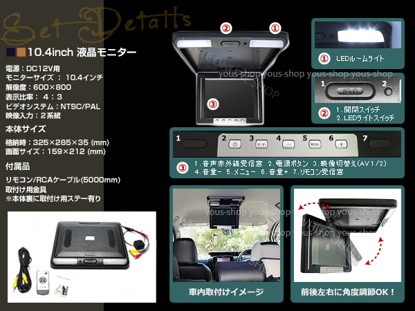 商 品 情 報 | ◇仕様◇ ■電源 DC12V ■消費電力 約9W ■ディスプレイサイズ 10.4インチ ■アスペクト比 4:3 ■ビデオ入力 二系統(ピン入力) ■解像度 800(H) RGB600(W)=1440000 ■輝度 250cm2 ■取付け 自動車の天井 ■寸法 幅 約32cm 奥行き 約29cm 高さ 約4cm ■重量 約1.8kg ※実寸ですので多少の誤差はご了承ください。 |