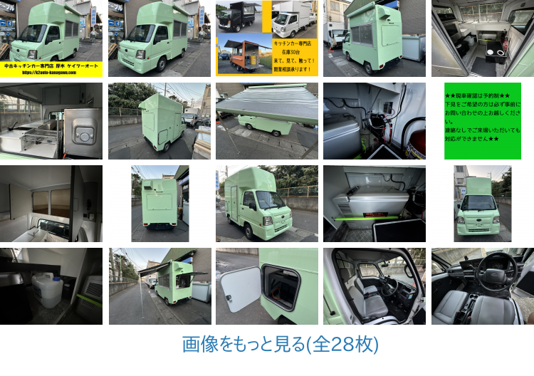 スバル サンバートラック平成24年式、走行距離42588km*1、 緑色のボディが印象的で、特種用途・加工車登録がされています。 ポータブル冷蔵庫、2槽シンクや給排水タンクも完備。営業やイベント出店など、多目的なニーズに対応できる一台です。 架装部の詳細な動作は未確認ですが、多様な可能性を持つバラエティ豊かなトラックです。