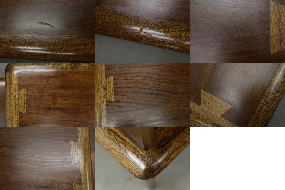 ウォールナットをメインに色味の異なる副材を蟻継ぎで組み合わせており、