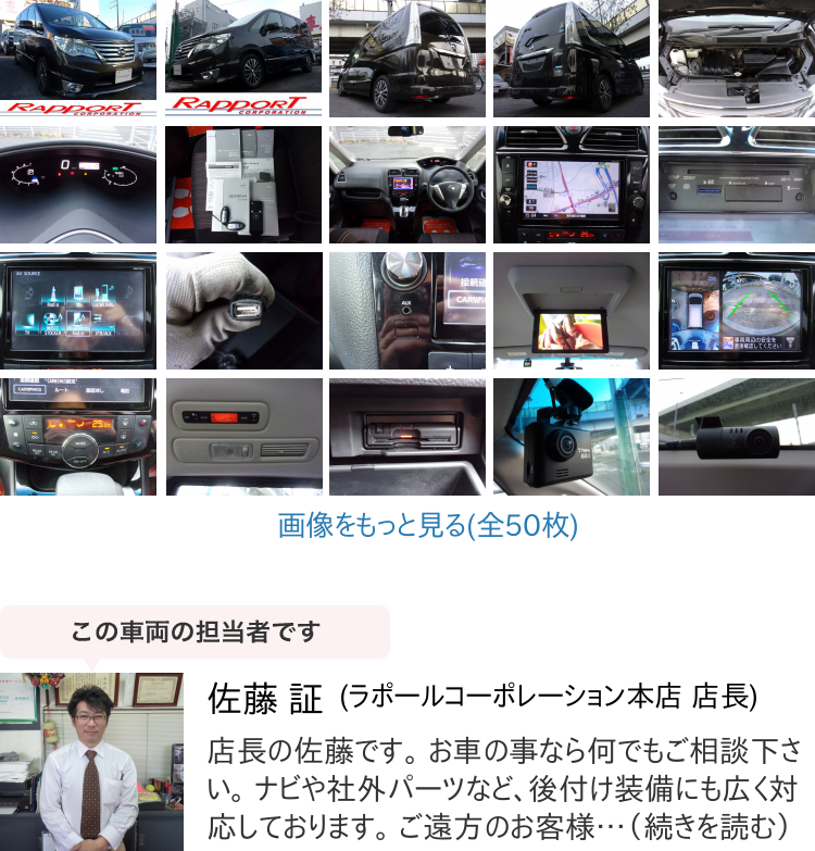 販売店による評価外装の状態 | 部分的に目に見えるキズやヘコミがあるものの、比較的きれいな車 | 内装の状態 | 目立つキズや汚れ、穴が無く、きれいな車 | 車両状態コメント | 内装:ワンオーナーの禁煙車で、非常に綺麗な室内です。外装:運転席のドアに板金塗装の痕跡が御座います。濃色系のボディカラーですので小傷は御座いますが、目立って大きな傷は御座いません。第三者機関による鑑定済み車両で、内装:4つ星、外装:4つ星(修復歴無)の評価を頂戴しております。 |