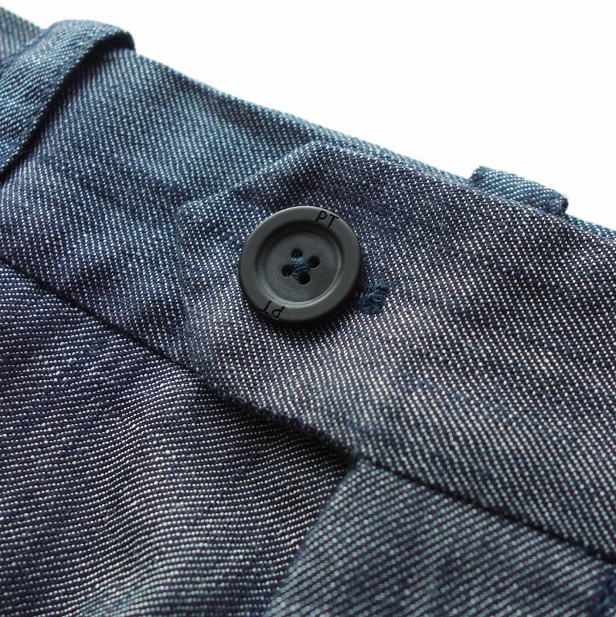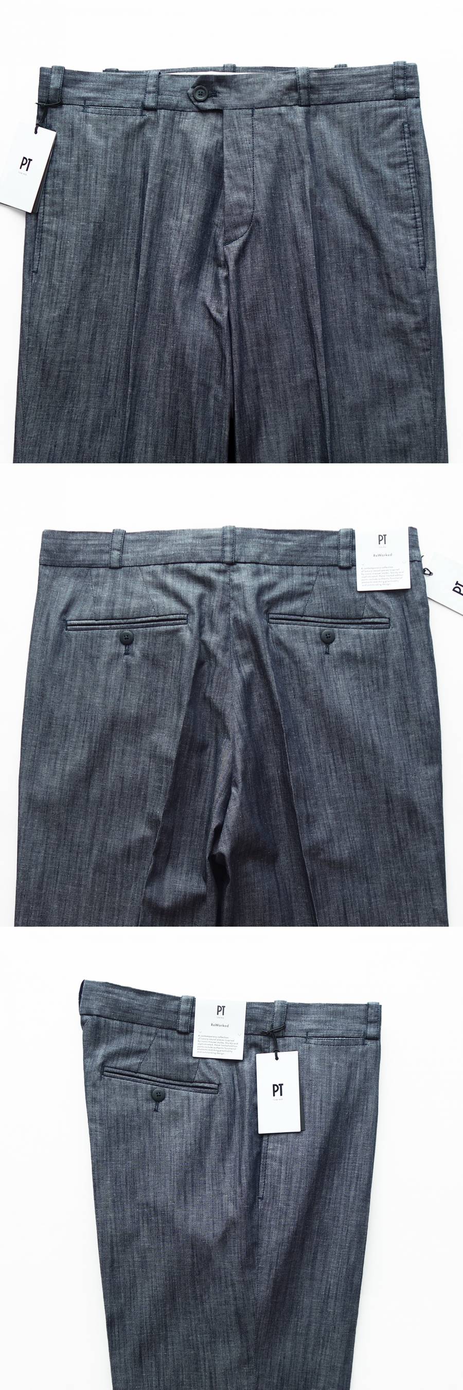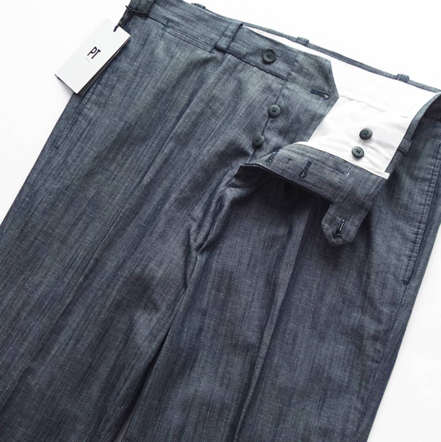 ご紹介するのは、「THE WRITER(ライター)」と名付けられたプレーンフロント(ノープリーツ)のワイドトラウザーズになります。ミリタリーを出自とするチノタイプのワイドトラウザーズですが、PTの手に掛かればご覧のとおり。本格的なテーラード仕立てを採用し、緩やかにテーパードを効かせた美脚効果の高いセミワイドシルエットをインプットすることで、トラウザーズならではの上品さを保ちつつカジュアルからモードまで合わせられるニュートラルなバランスを実現しています。チノタイプのワイドトラウザーズにしては珍しいリネン混のダンガリー素材を採用しているところがミソ。程よく薄手でさらっとした肌触りなので春夏の着用にもってこいです。ユルさ加減がちょうどいい今どきのフィッティングですが、膝下から裾へかけて緩やかにテーパードするPTならではの緻密に計算された設計になっているので、ゆとりがあるのにもたつかず、実際に穿くとすっきりと洗練されて見えます。若者が穿いているワイドパンツとの違いは一目瞭然。生地の上質感やシルエットの美しさがまるで違います。カジュアルスタイルはもちろん、ジャケットスタイルのハズシにも使える大人専用のワイドトラウザーズゆえ、期待以上の働きをしてくれると思います。