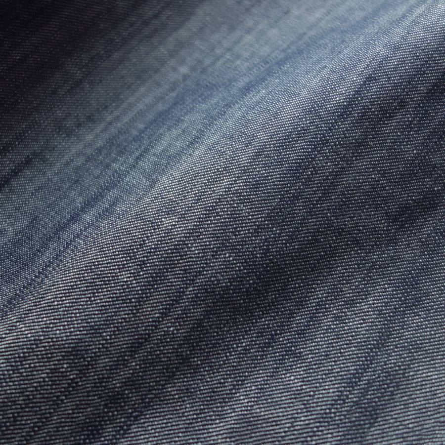 使用されている生地は、厳選されたコットンにリネン、リヨセル、ポリウレタンを加えた四者混素材から紡がれた細糸を用い、低速織機でクラフト感を添えて織り上げた“ダンガリー(薄手デニム)”になります。夏にデニムは暑いですが、この生地の場合、約250グラムという絶妙な目付け量でして、程よく薄手で通気性がよく汗をかいても蒸れにくいことが特徴です。さらっとした爽やかな肌触りはリネン混ならでは。肌に触れてもベタつかないので夏でも気持ちよく着用できます。一般的なダンガリー(薄手デニム)とは違って薄手なのにフニャッとしない、さらには質感に深みがあってチープな感じにならないところがポイント。画像ではお伝えできませんが、透き通るような光沢を帯びているので高級感も申し分ありません。加えて、洗いを施すことで生み出された独特な柔らかさ、リヨセル(セルロース繊維)のしなやかな落ち感、ポリウレタンのストレッチ性なども見逃せません。もちろん自宅で洗濯(水洗い)可能です。