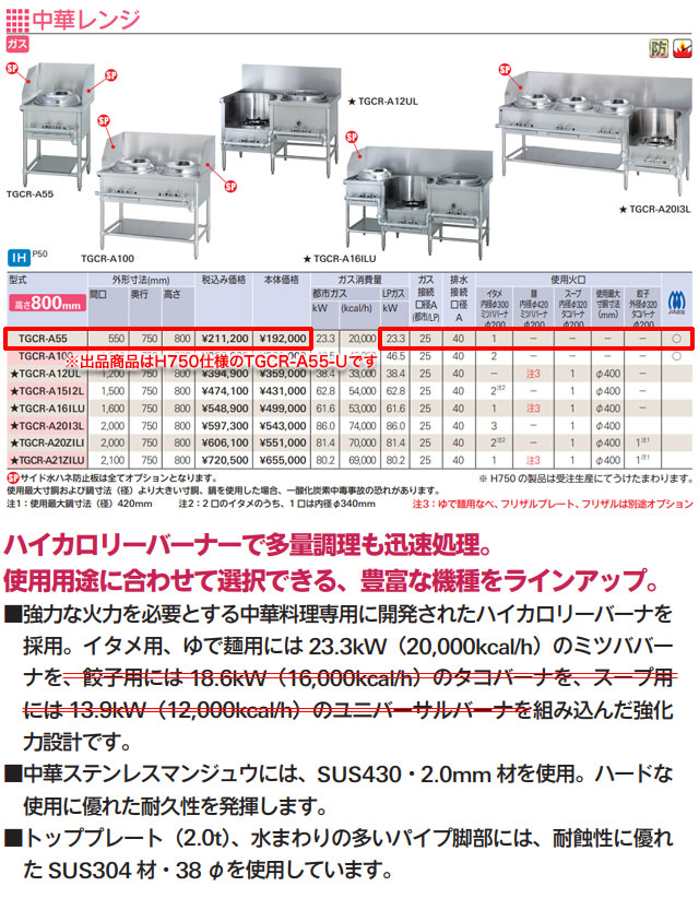 タニコー 1口中華レンジ(イタメ) TGCR-A55-U を出品いたします。 ■特徴■ ハイカロリーバーナーで 多量調理も迅速処理。 強力な火力を必要とする 中華料理専用に開発された ハイカロリーバーナを採用。 23.3kW(2000kcal/h)のミツババーナを 組み込んだ強火力設計です。 中華ステンレスマンジュウには、 SUS430・2.0mm材を使用。 ハードな使用に優れた耐久性を発揮します。 トッププレート(2.0t)、 水まわりの多いパイプ脚部には、 耐蝕性に優れた SUS304材・38φを使用しています。 ■仕様■ 2022年製と比較的新しく 動作確認済みですのでご安心ください。 (検査時の写真をご覧ください) 写真に写っている周りのものは付属しません。 発送はアート家財おまかせ便でお送りします。 定価192,000円の高価な商品です。 格安出品いたしますのでこの機会をお見逃しなく! |