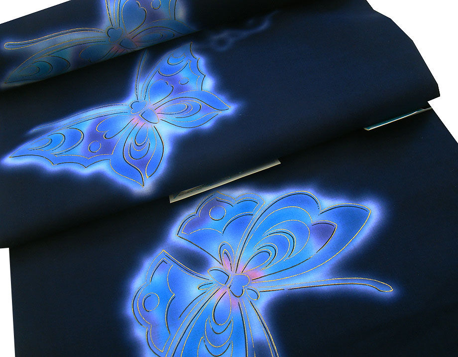 暗い濃紺色地に金色、水色、薄紅梅色等の蝶柄。市場価格25,800円。