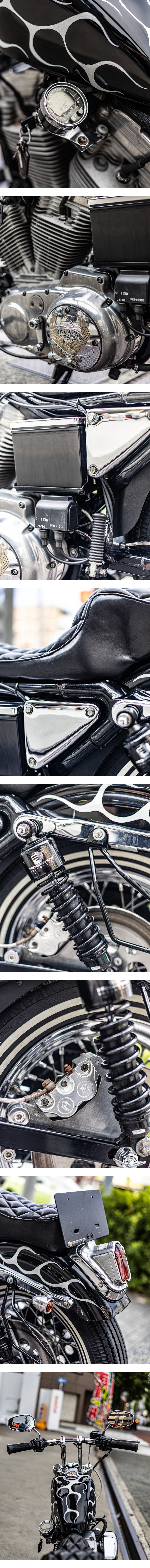 空冷およびキャブ車絶版化により人気高騰中のエボスポの中でも人気の、リジッドマウントEVOのキャブ仕様、XLH883をベースに、フレイムスペイントがワイルドなチョッパーカスタムが施された上質美車な1台。