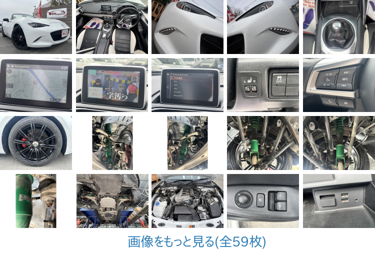 ▼販売店コメント | ドライブ好きにぴったりのマツダ ロードスターを入荷しました!平成27年式オープンカーで、走行距離77262kmの良好なコンディションです。スタイリッシュなホワイトボディと豊富な装備が魅力的。LEDヘッドランプ、MT、スマートキー、シートヒーター、ETC、ナビ、TV、CD、DVD再生、USB、そしてアルミホイールがあなたのドライブを特別なものに。ABSやESCによる安全技術も完備し、安心快適にご体験ください。 |