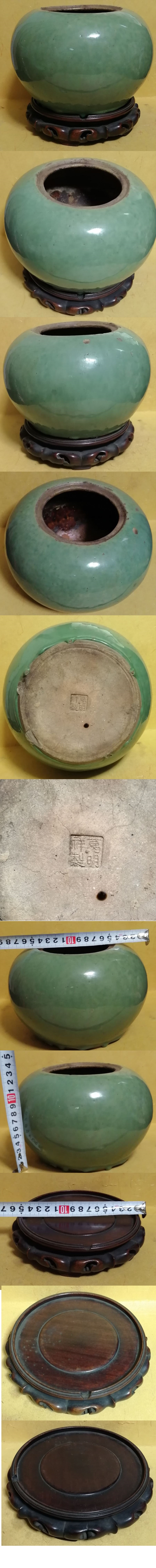 保証品 清代 乾隆年 葛明祥造 瑠璃釉 宜興 水鉢 香炉 在銘 緑釉 花瓶 在銘 唐木 共座