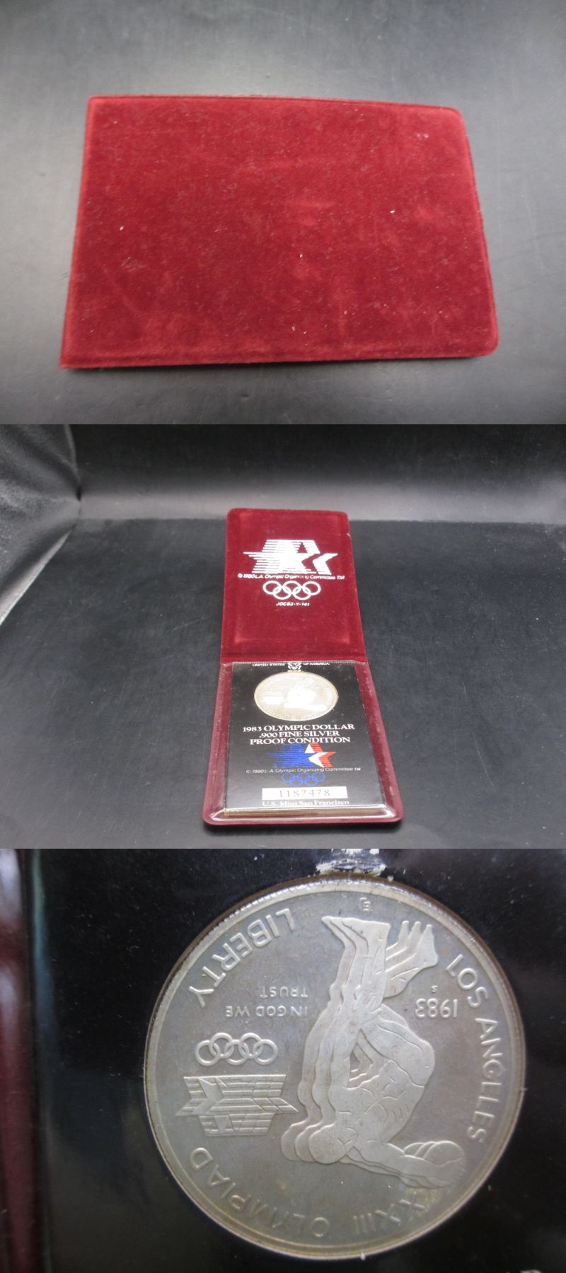 デザイン: 古代ギリシャの円盤投げ選手(ディスカススローワー)をモチーフにしたデザイン。 LIBERTY(自由)、LOS ANGELES XXIII OLYMPIAD(ロサンゼルス 第23回オリンピアード)の文字が刻まれています。
