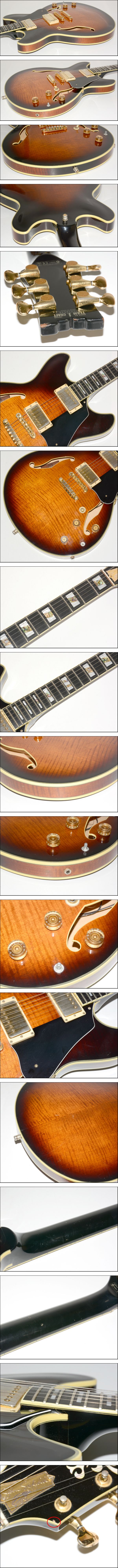 こちらはUSED品になります。 ・ボディ正面、背面にスレ、キズ、打痕が見られます。 ・ボディ側面に多少のスレ、キズ、打痕、僅かな塗装はがれが見られます。 ・ボディ底面にスレ、キズ、打痕が見られ、ストラップピン周囲に塗装クラックが見られます。 ・ネックにスレ、キズ、打痕が見られます。 ・ネックジョイントに塗装クラックが見られます。 (画像にてご確認ください。) ・ヘッドに多少のスレ、キズ、打痕、塗装はがれが見られます。 ・電装系に改造された跡が見られます。 ・指板に多少のスレ、小キズが見られます。 ・ナット側面付近に塗装クラックが見られます。 ・バインディングにスレ、キズ、多少の打痕が見られます。 ・ペグ・ピックアップ・ブリッジ等金属部分に多少のスレ・キズ、くすみ、 メッキはがれ等が見られます。 ・ピックガードにスレ、キズが見られ、ネジは非純正品です。 ・ピックアップに多少のスレ・キズ・打痕、ヒビが見られます。 ・ノブに多少のスレ、キズが見られ、片方のトーンノブが欠品しています。 ・セレクタースイッチに多少のスレ、小キズが見られます。 ・ネジに多少のスレ・サビ、小キズが見られます。 全体的にスレ、キズ、打痕、塗装クラック、塗装はがれ等が見られますが、 上記の点以外に特に目立ったキズ、ダメージは見られません。 ネックはほぼストレートの状態ですが、僅かに順反り傾向です。 (現在の弦高は12Fで、1弦側:約2.0mm、6弦側:約2.0mm) 重量:約3.7kg、ナット幅:約43mm、スケール:約627mm |
