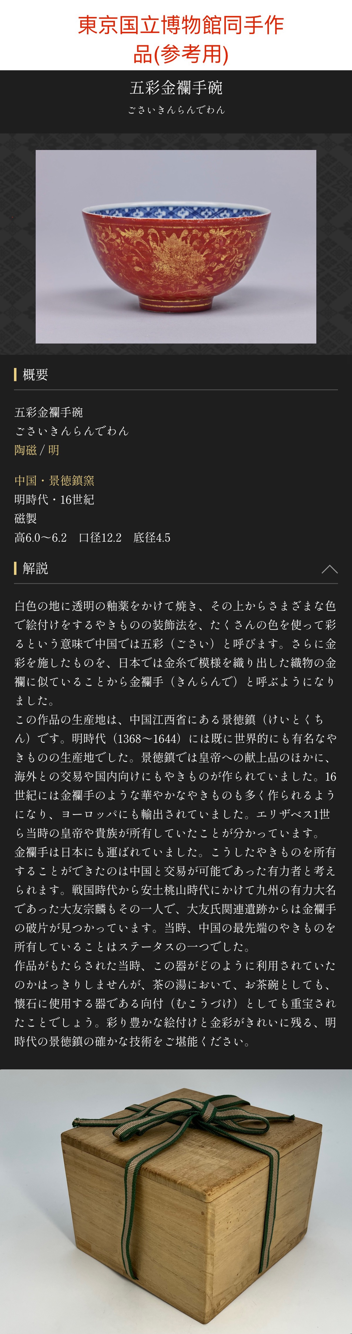 | 商品名 | 明時代 赤地金襴手花卉紋碗 明時代嘉靖年間 箱付き 唐物 中国美術 a10021 | |