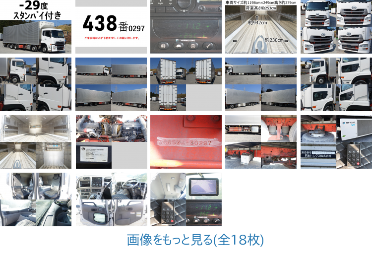 販売店による評価外装の状態 | 部分的に目に見えるキズやヘコミがあるものの、比較的きれいな車 | 内装の状態 | 部分的に目に見えるキズや汚れ、穴があるものの、比較的きれいな車 | 車両状態コメント | 438番 スタンバイ付き -29度 低温 冷蔵冷凍 積載12.2t 後輪エアサス キーレス 左電動格納ミラー 左右電動角度調整ミラー バックカメラ ベット 車検証サイズ1198×249高379 荷台内寸942×230高253 |