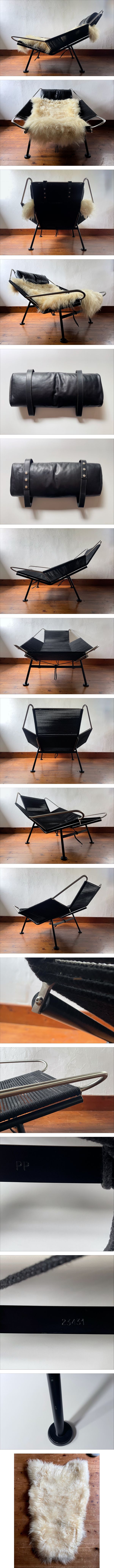 1950年.デンマーク.PP Mobler社.Hans J.Wegner(ハンス・J・ウェグナー)デザインによる PP225 .通称.フラッグハリヤード。黒塗装のベースにフレームはオールポリッシュ,ロープとネッククッションは黒,ナチュラルなシープスキンでの構成です。刻印は「PP 23431」… 2015年位の製作分かと思います。状態..後部右脚にに僅かな小キズある位で他,美品,綺麗です。ロープも確り張られています。ネッククッションはカバーで守られていましたので,若干の使用感はありますが表面的なイタミ等はありません。毛足の長いシープスキンには使用に伴う,若干のクセやツブレがありましたが1日かけて空気を取り込みふんわりと仕上げております(定期的にメンテは必要との事)。寸法…104x115xH80cm.SH38cm。ちなみに現在の定価.¥2466200。