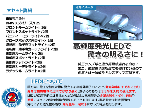 商 品 情 報 | 【商品内容】セット内容 フロントルームライト× 1個 フロントスポットライト× 2個 バニティーミラーライト× 2個 グローブボックス内ライト× 1個 運転席・助手席フットライト× 2個 運転席・助手席カーテシーライト× 2個 後部席ルームライト× 2個 後部席スポットライト× 2個 後部席フットライト× 2個 後部席カーテシーライト× 2個 ラゲッジルームライト× 2個 適合車種 X3(F25) |