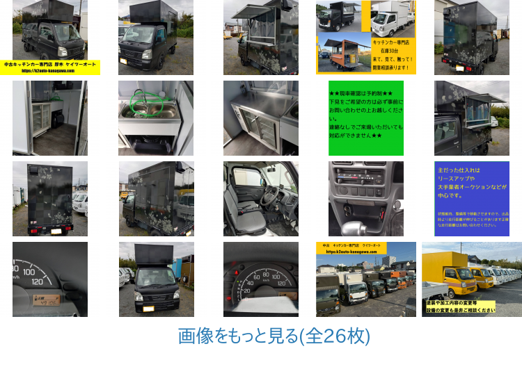 走行距離49106km*1と程よく手軽な黒系(色替です元白)ボディが特徴です。この車両はキッチンカー仕様で、冷蔵庫・シンクや換気扇、跳ね上げ販売口、カウンター、透明窓を完備しています。