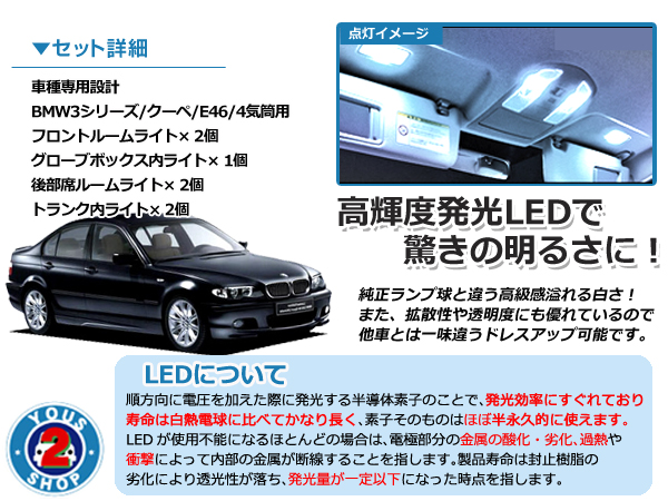 商 品 情 報 | 【商品内容】セット内容 フロントルームライト× 2個 グローブボックス内ライト× 1個 後部席ルームライト× 2個 トランク内ライト× 2個 適合車種 クーペ 4気筒用(318Ci) ※6気筒は適合不可 |