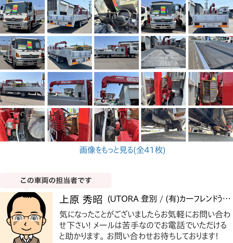 弊社では車両の塗装・架装等も承っておりますので お気軽に車輌・納車・陸送・代金などお電話にてお問い合わせ下さい。 尚、当店の営業は9時から18時までとなっております。 現車確認は常時可能でございます。 ご来店の際は事前にお電話にてご連絡下さいませ。 ご覧頂きありがとうございます。 ■この車への「お問合せ」・「無料見積り依頼」、「在庫確認」は、お気軽にどうぞ! ■この車両以外にも「車選びドットコム」におすすめの中古車を掲載しております。 他の在庫車種、お店へのアクセスは【販売店情報ページ】をご覧ください。 問合わせ・来店の際には「中古車情報サイト(車選びドットコム)を見た」とお伝えください。 店頭商談中・売約済の場合もありますので、ご来店の際は事前にお問合せ頂き、該当車両の有無をご確認ください。