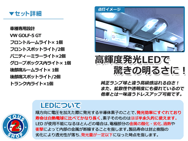 商 品 情 報 | 【商品内容】セット内容 フロントルームライト× 1個 フロントスポットライト× 2個 バニティーミラーライト× 2個 グローブボックス内ライト× 1個 後部席ルームライト× 1個 後部席スポットライト× 2個 トランク内ライト× 1個