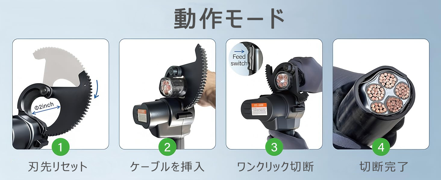 【幅広い用途】当社のケーブルカッターは、最大1000MCMの銅線、最大50MMのアルミ線、そして外装ケーブル(?50mm)を、破損や歪みなく、きれいで滑らかな切断が可能です。