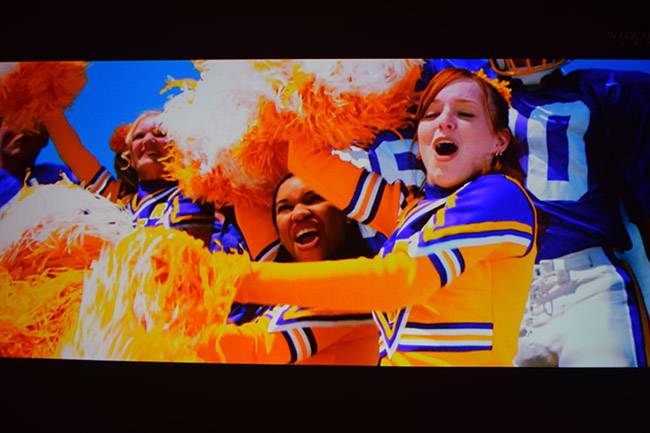 色彩鮮やかに濃密な映像が映し出されています。2400ルーメンの高輝度モデルだけあってスクリーン全体に力強さがあり、際立った鮮鋭感を感じます。白背景画面時若干色ムラが視認されますが通常画面では判らないレベルですので普段の視聴に支障は無いと思います。DEEPBLACK効果による高い暗部階調表現力、引き締まった黒、漆黒のフルHD映像は秀逸です。特に、32万:1のコントラスト比は驚異的なコントラスト感で、前機種TW8000(コントラスト比20万:1)と見比べてみても格段に進化しているのがわかります。緻密な描写力も素晴らしく、各シーンの背景の細部まで素材の質感がわかり、目の前の膜を数枚取り除いたような繊細な描写による立体感や空気感、透明感を感じさせる高品位な映像表現には「透過型液晶プロジェクターもここまで来たか!」と感嘆します。実写映像は添付写真をご覧ください(120インチホワイトマットスクリーンに当出品機で実際に投射した映像です)。