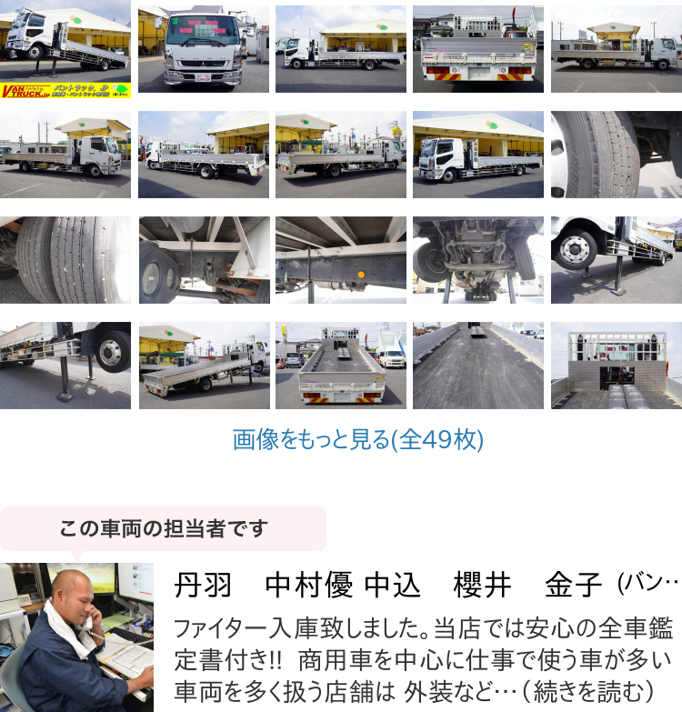 販売店による評価| 外装の状態 | 部分的に目に見えるキズやヘコミがあるものの、比較的きれいな車 | | 内装の状態 | 部分的に目に見えるキズや汚れ、穴があるものの、比較的きれいな車 | | 車両状態コメント | このたびはバントラックJPの車両を閲覧していただきありがとうございます。 車両の詳細は以下のURLにてご確認できます。 https://www.vantruck.co.jp/index.html こちらの車両以外にも豊富な在庫揃えておりますので お気軽にお問合せください。Tel:048-993-0081 |