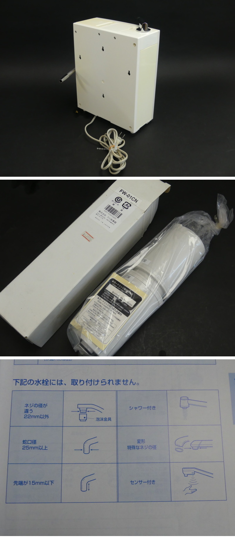 ◇商品情報◇ | 当店の商品をご覧いただきありがとうございます!! フジ医療 TREVI FWH-6000 アルカリイオン整水器 電解水生成器 浄水器 電解水素水 FW-01CN カートリッジ付 常用で使われていたものです。 取り外し前に吐水口より水が流れることを確認できました。 カートリッジは本体にセットされている(交換時期ランプ点灯品)物と未使用のカートリッジが付属しています。 本体操作ボタンにて操作出来ました。 本体内部の水はできる限り空にしてありますが輸送時などに微量の水が出るてくる可能性がありますので予めご周知ください。 経年相応のスレや薄汚れ、一部ボディに色焼けあり 説明書、替えカートリッジ、ホース類が付属しています 対応の蛇口などは別途でお調べください。 取り付けの際に部品などが必要な場合は別途でご用意ください。 種類、点数、状態などは画像よりご確認、ご判断くださいませ。 ※目視チェックをしていますが、表記漏れや見落としや細かな擦れ・薄汚れなどがある場合もございますので予め画像をご確認の上でご入札をお願いいたします。 商品のトップ画像端に写っている茶筅はサイズ比較用の備品ですので付属はしません | ||||||||||||||||||||||||||||||
