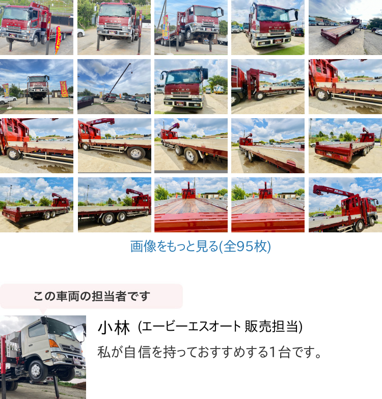 当店の車両ラインナップは、トラックを中心に国産・輸入車・小型、中型、大型、マイクロバスなど、どんな中古トラック・重機でも買取しております。お客様のご要望に合わせた車両をご提供いたします。当店の車両は、厳しい基準をクリアしたもののみを展示しておりますので、安心してご購入いただけます。