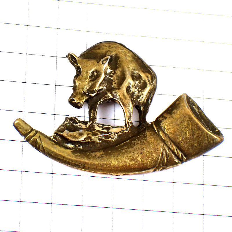 ピンバッジ・イノシシ猪ホルン楽器ハンティング狩猟ブロンズ色アンティーク真鍮色◆フランス限定ピンズ◆レアなヴィンテージものピンバッチ