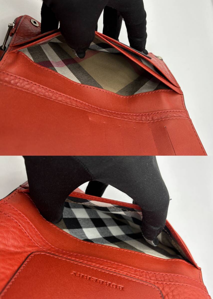 【中古】バーバリー ロングウォレット タータンチェック 赤革 箱付き
