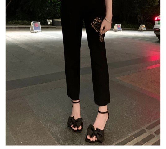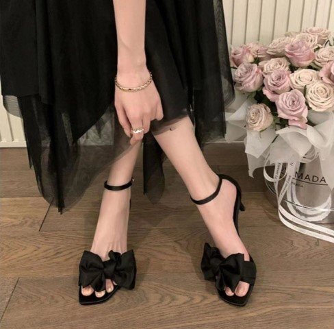 レディース ミュール フラット 7.5cm オープントゥ 厚底 美脚 脚长 リボン スタイルアップ 22.0cm(34) 黒