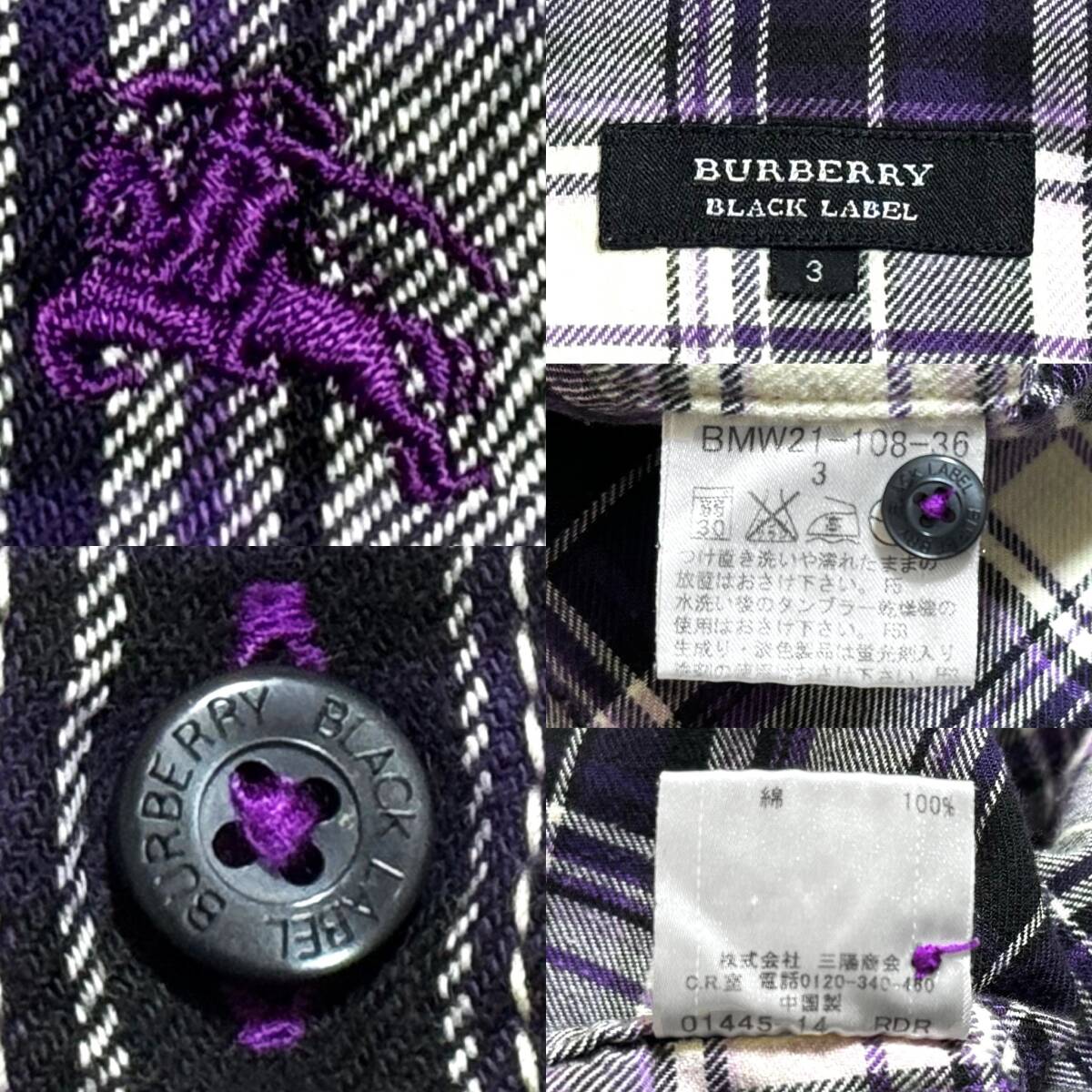希少! 极美品 バーバリーブラックレーベル BIGホース刺繍 ノバチェック 総柄 ダブルポケット 长袖 ネルシャツ 3/L 紫 BURBERRY BLACK LABEL