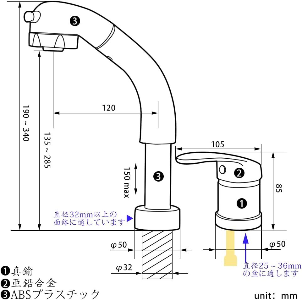 コンパクト 洗面台蛇口 洗面水栓 ツーホール式 洗髪用 シングルレバーホース引き