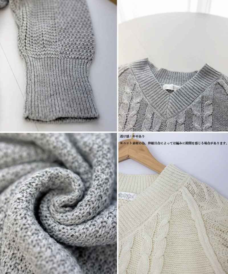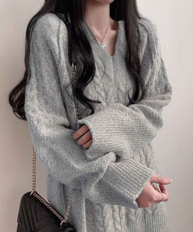 长袖ケーブルニットチュニック カジュアルワンピース ミニワンピ ショート丈ワンピ ニットワンピライトグレー