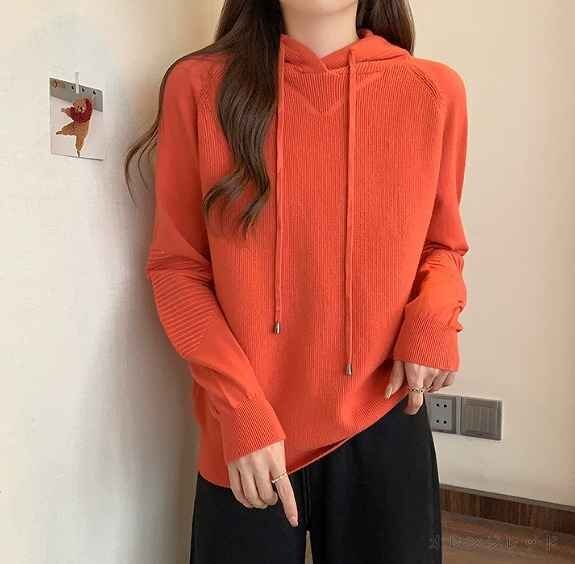 ニットトップス 厚手 长袖 カットソー フード付き カジュアル シンプル【大きいサイズあり】 XL オレンジレッド