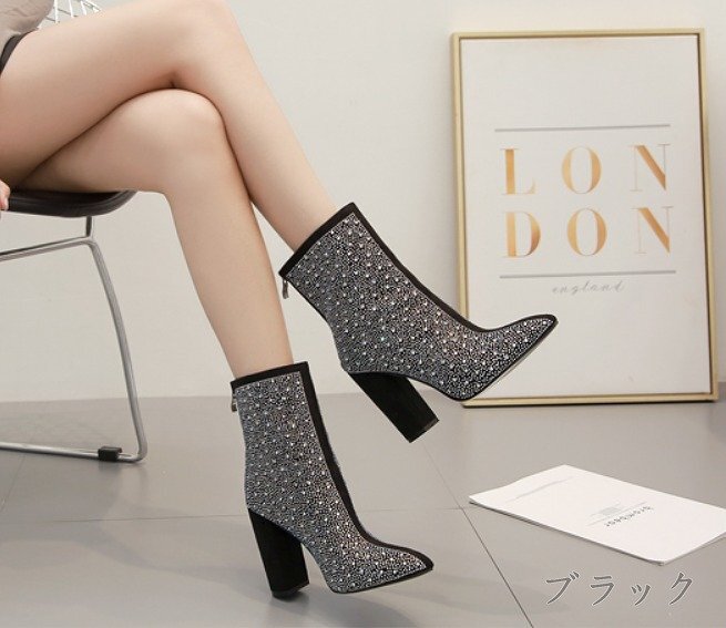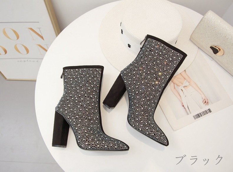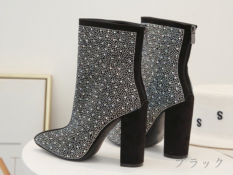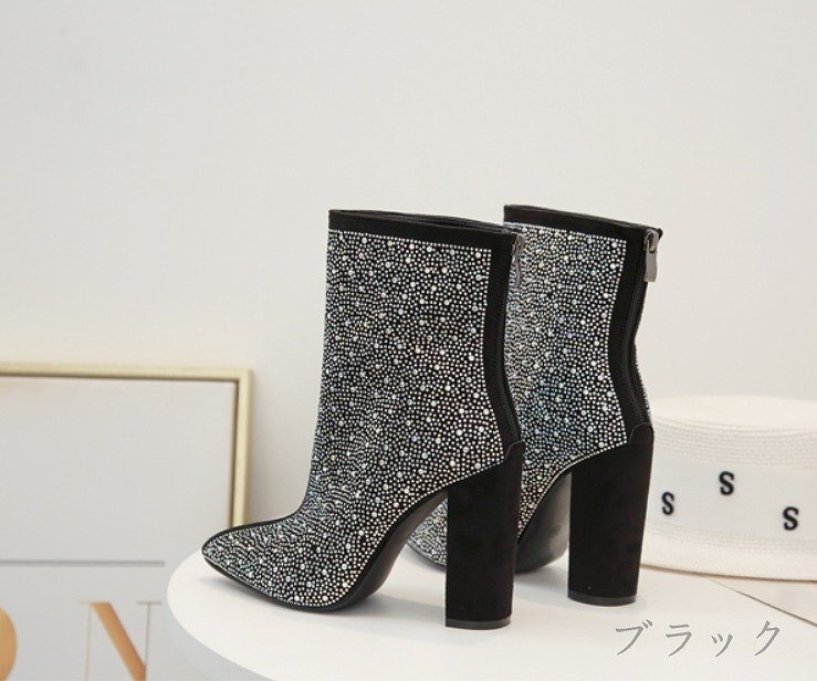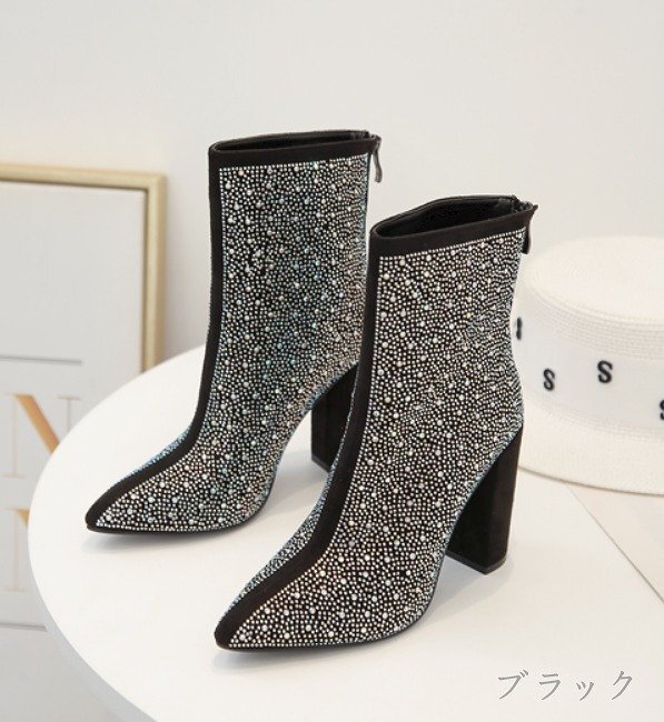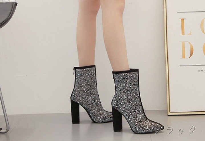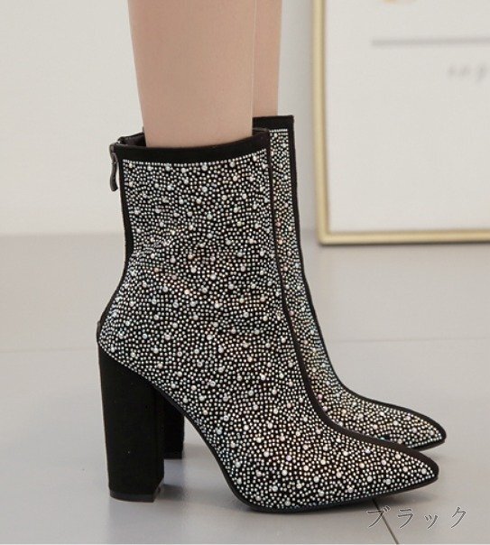 ブーツ 太いヒール とんがりトゥ 切り替え シンプル 【41】25~25.5cm ブラック