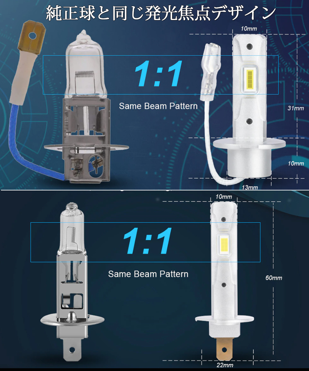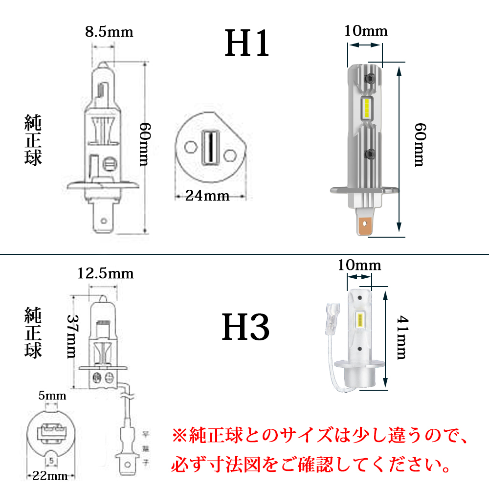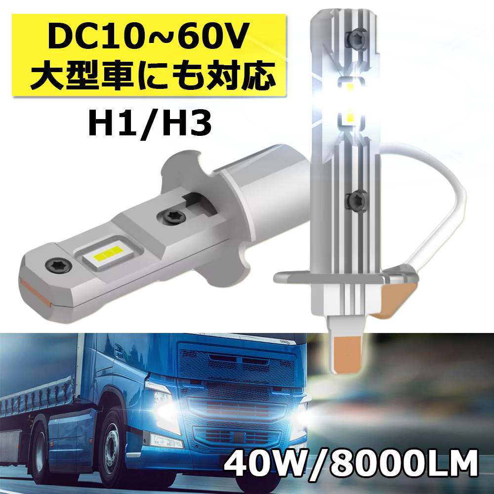 LEDヘッドライト フォグランプ H1/H3 DC12/24V兼用 大型车対応 ポン付け コンパクト 10~60V 40W 8000ルーメン 6000K 2本セット