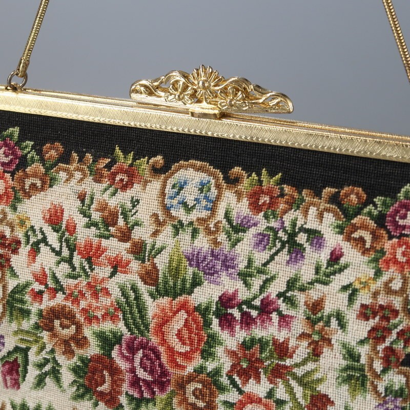 MI1711△Vintage プチポワン プチポアン 花柄刺繍/フラワー チェーンハンドル ミニバッグ ハンドバッグ 手提げ 鞄 ブラック系/ゴールド