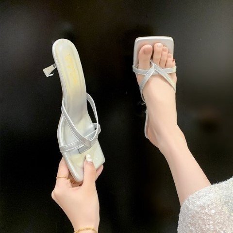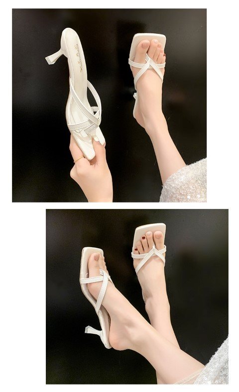 レディース トングサンダル ストラップ 黒 光沢感 きれいめ スクエアトゥ 华奢ストラップ 23.5cm(37) ホワイト