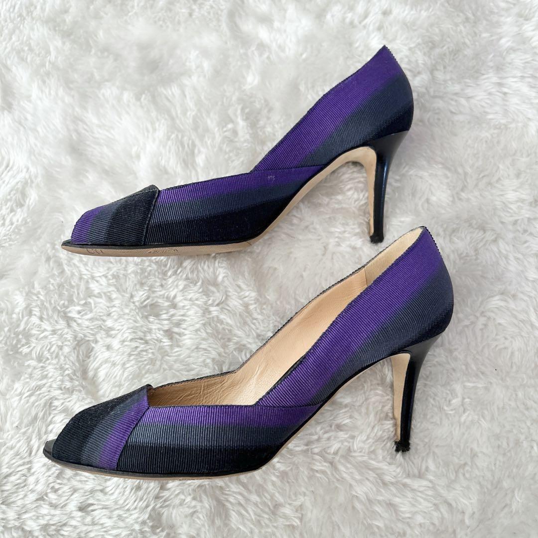 美品Sergio Rossi セルジオロッシリボンパンプス 38.5 ブラック パープル 25.5㎝ ピンヒール オープントゥ